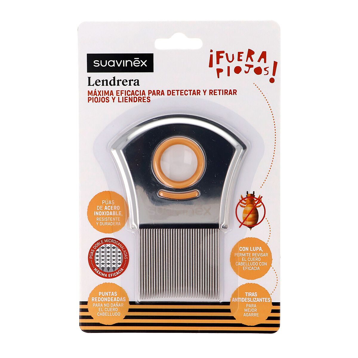 Lendrera Suavinex con púas ultra finas para eliminar piojos y liendres eficazmente sin dañar el cabello. Diseño ergonómico y seguro para toda la familia.